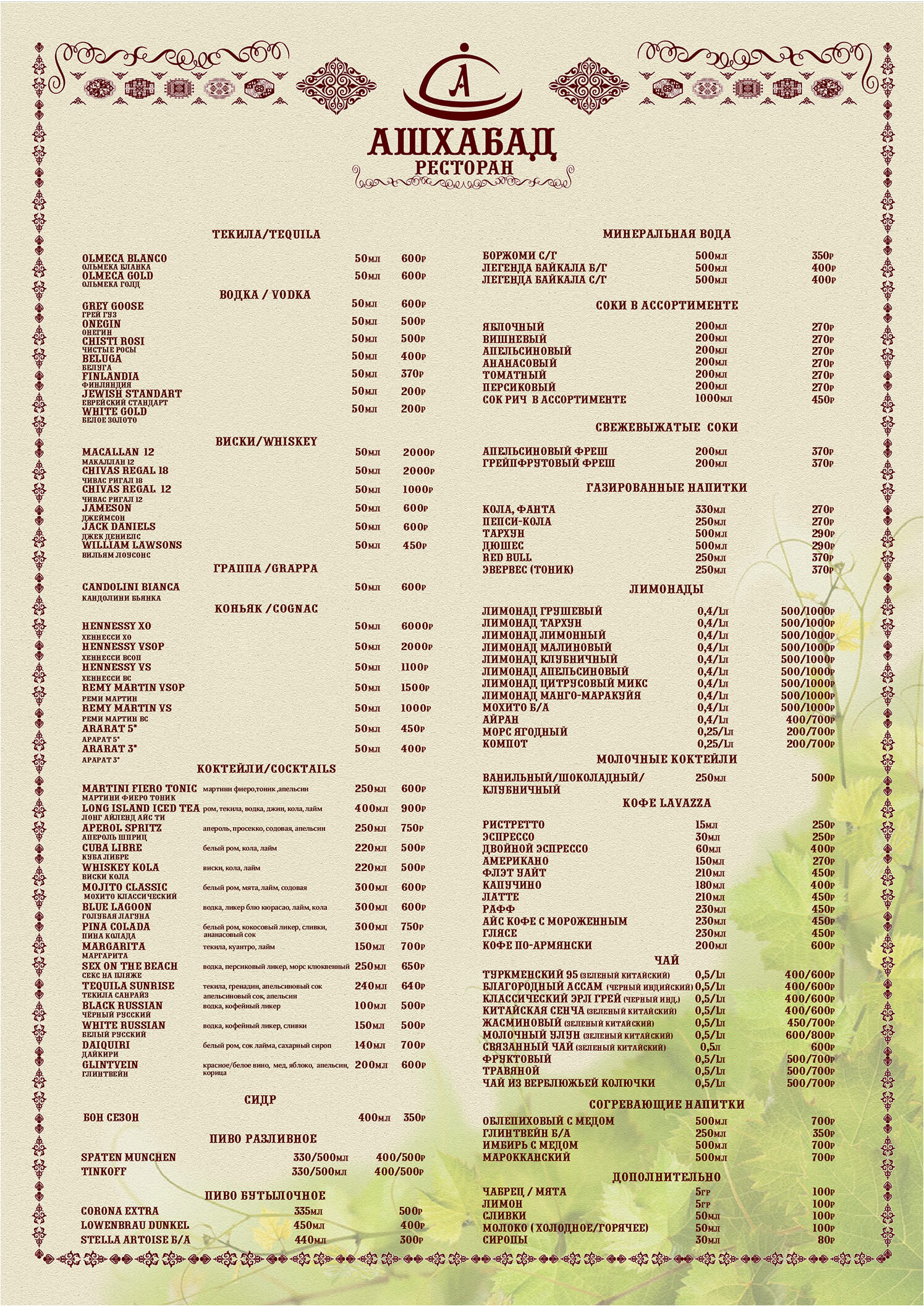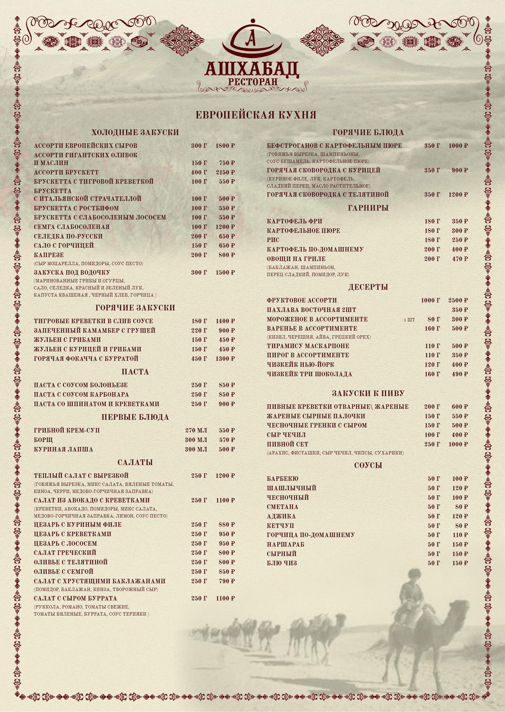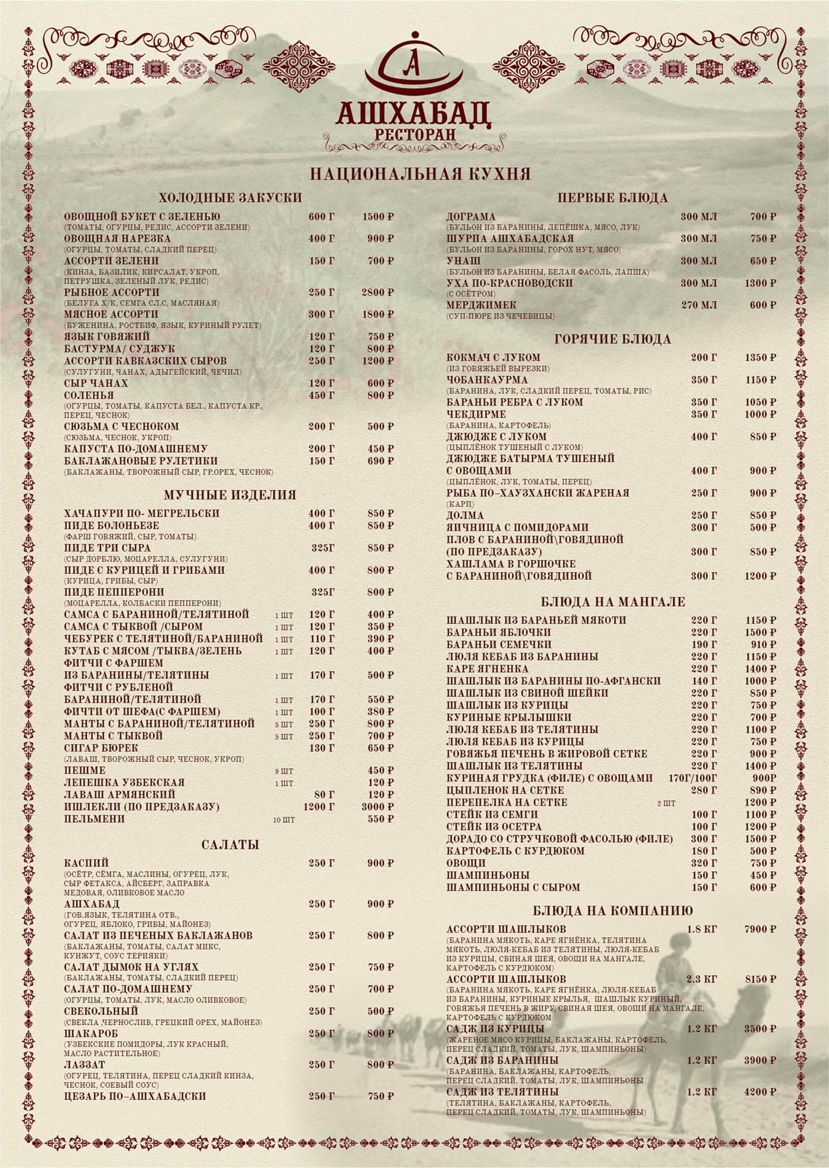 В «Ашхабаде» мы готовим с уважением к туркменским традициям и вниманием к современным вкусам. Меню ресторана сочетает в себе аутентичные блюда восточной кухни и популярные европейские позиции.